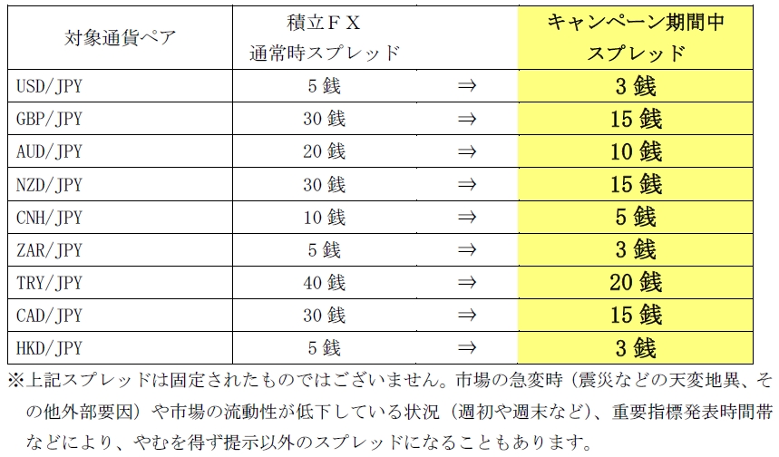 今般、この「積立FX」において、以下のとおり、コスト(※)の大幅削減とスワップポイント(一般的な外貨預金では金利に相当)を大幅優遇する“「積立FX」今がチャンス!キャンペーン”を2017年2月9日(木)より実施いたします。ぜひこの機会に「積立FX」をご利用ください。