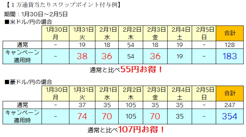 ② 特定の曜日におけるスワップポイント(一般的な外貨預金では金利に相当)を通常時と比べ2倍に優遇
