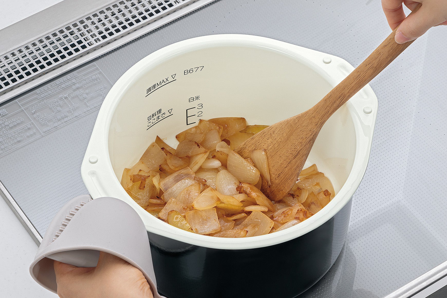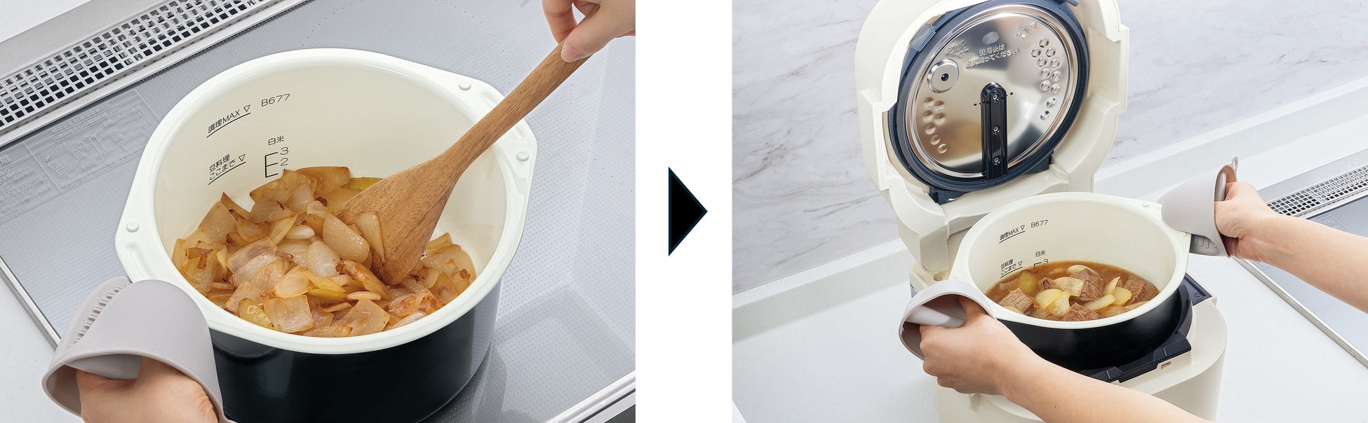 ホーローなべを使ってIHやガス火で食材を炒め、なべをそのまま本体にセットし、「焼き煮込み」コースを選択してスタートすれば、あとはおまかせで調理が完成します。