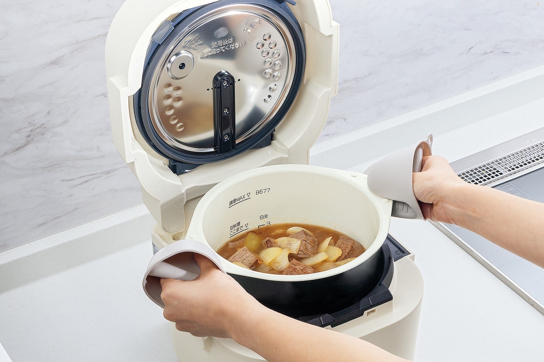 新製品は、“ほったらかし”調理による「手軽さ」「時短」や自動調理メニューの充実はもちろん、感動的なおいしさを目指して、高い蓄熱性で味が染み込みやすく煮込み料理に適した「ホーローなべ」の採用や、煮込む前に食材を炒めることで香ばしさとうまみを引き出しておいしく仕上げる「焼き煮込み」コースを搭載。また、「象印アプリ」との連携によって献立提案や食材・調味料を入れるタイミングをお知らせするなど、“手間を省いても手は抜かず、おいしい料理を作りたい”という方の毎日の料理をもっとおいしく、もっと便利にします。