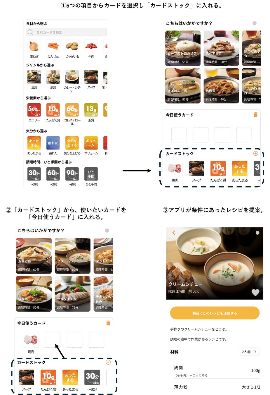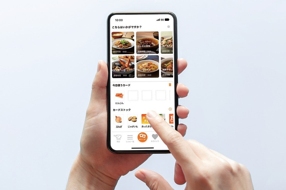 「食材」「ジャンル」「栄養素」「気分」「調理時間」の5つの項目から、アプリと対話するようにカードを選んでいくだけで、気分に合ったレシピを提案し、献立決めをサポートします。