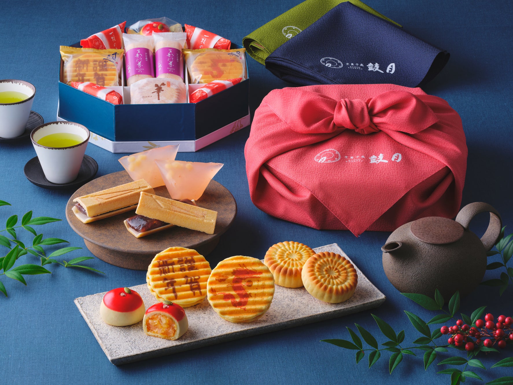 特徴的な八角箱は贈り物として縁起の良い末広がりの「八」にあやかり、詰合せ商品は1年以上かけて検討し、限定商品の「一枝(ひとえ)の梅」「迎春プレミアム千寿せんべい」を含む5種類を厳選しました。また、八角箱を風呂敷でお包みし、いつもよりワンランクアップした詰合せに仕立てました。風呂敷包みにすることで日本の伝統文化を繋ぎつつ、通常の包装紙を使用せずにラッピングができるため環境にやさしい商品になっております。