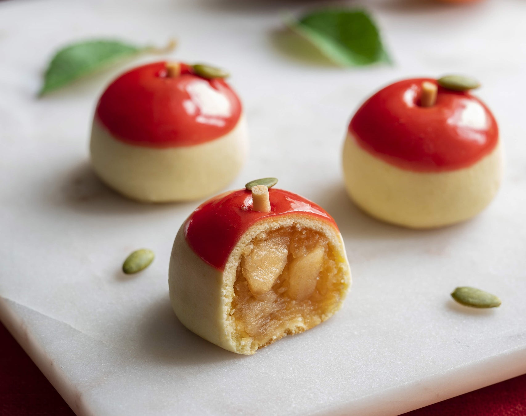自社製の白餡にブランデー入りシロップで煮込んだドライりんごを混ぜることで、シャキシャキと歯ごたえがありつつも瑞々しく 豊かな風味のりんご餡が入った果実焼饅頭です。