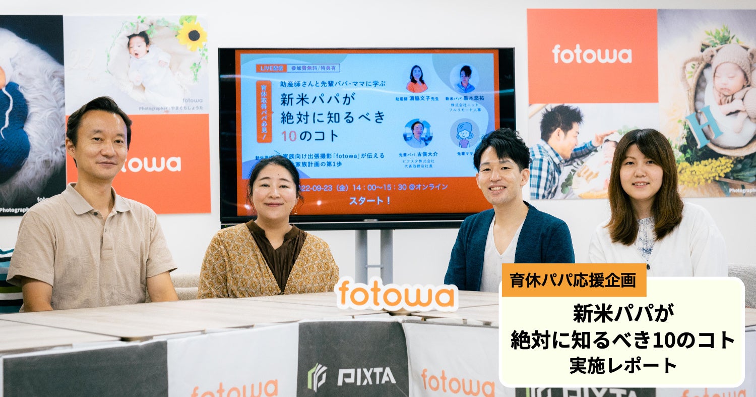 ピクスタ株式会社(東京都渋谷区 代表取締役社長:古俣大介、東証グロース:3416、以下「ピクスタ」)が運営する、家族・子ども向け出張撮影プラットフォーム「fotowa(フォトワ)」は、9月23日(金・祝)に、オンラインイベント《育休取得パパ必見! 助産師さんと先輩パパ・ママに学ぶ「新米パパが絶対に知るべき10のコト」》を実施しました。