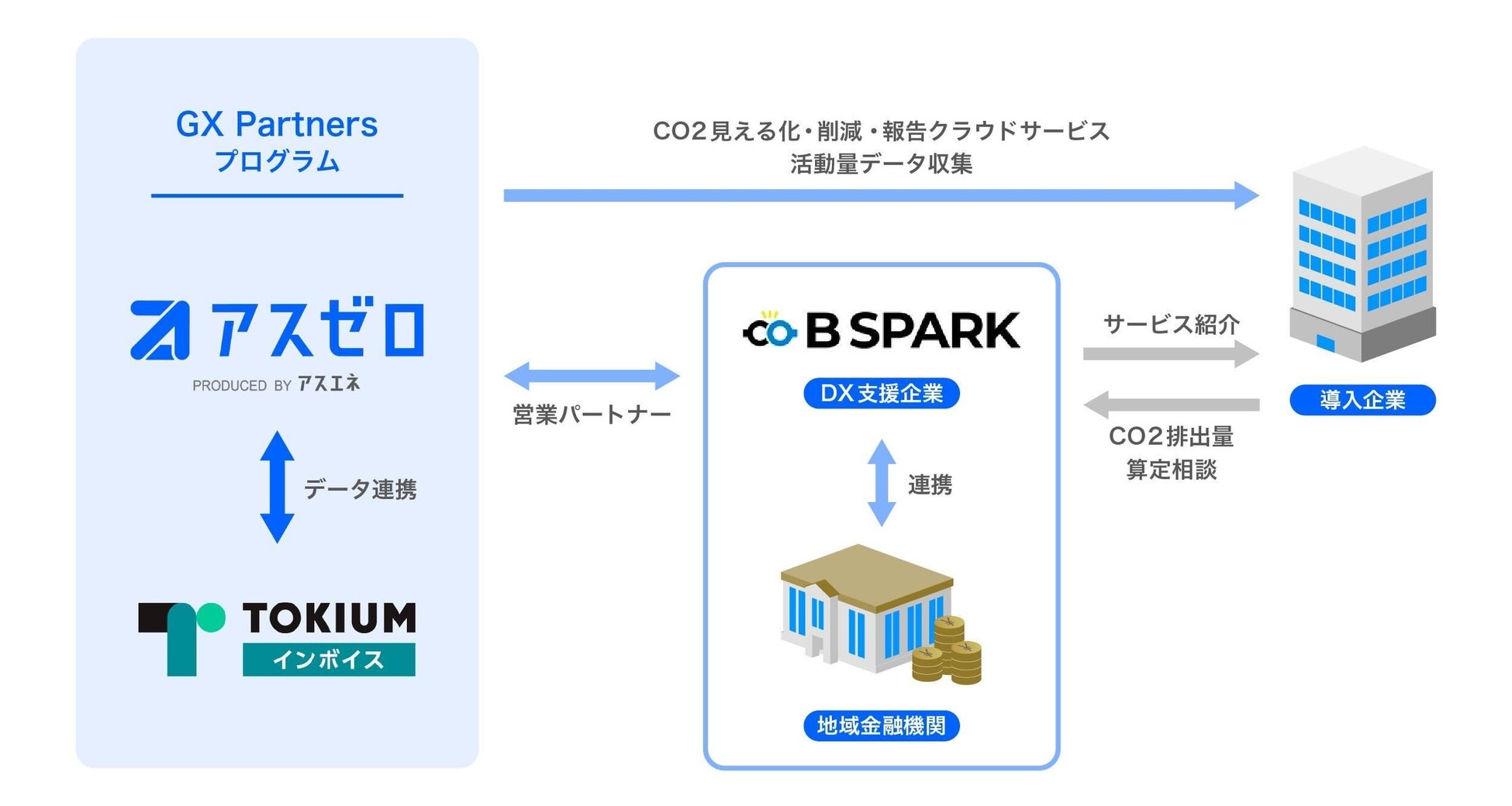 請求書受領クラウド「TOKIUMインボイス」で受領した請求書データの活動量をCO2排出量見える化・削減・報告クラウドサービス「アスゼロ」に一括インポートが可能となり、 インポートしたデータを基に排出量の計算を行うことができます。また、B Sparkの持つ金融機関ネットワークにより、広範に渡ったフォローやコンサルティングが可能となります。