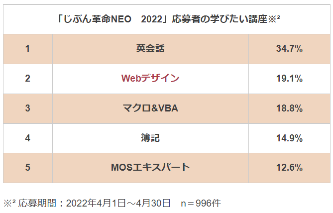 - 「じぶん革命NEO 2022」応募者の学びたい講座ランキング:1位は英会話(34.7%)、2位はWebデザイン(19.1%)