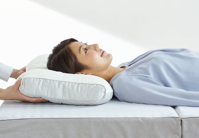「&Free」のオーダーまくらは、オリジナル測定器で後頭部や首の高さなどを細かく計測し、高さ、素材、フィット感を確かめながら調整してお客様に最適なまくらをお作りします。最大14ヶ所の高さ調整ポイントを設け、詰め物は全10種類(※2)からお好みの素材をお選びいただけます。「&Free」のマットレスは、点で支える独自の凹凸構造が体圧を分散させて理想的な寝姿勢を保ち、質の高い眠りへ導きます。