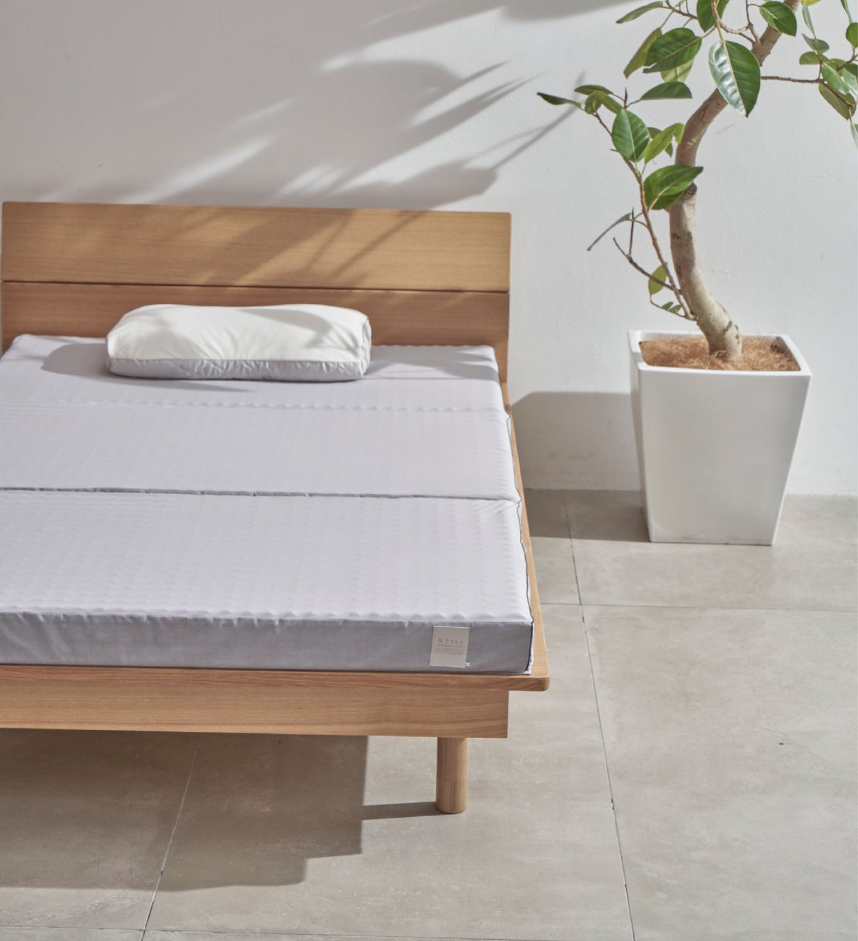 4層特殊立体クロススリット構造のマットレス。上層部表面の1800個(シングルサイズの場合)もの凹凸が体圧を分散し、3×3のブロックがそれぞれ独立して寝姿勢を保持。調整層がクッション性を高め、身体のボディラインにフィットし、横向き寝も快適です。また、クロススリットが優れた通気性を発揮します。