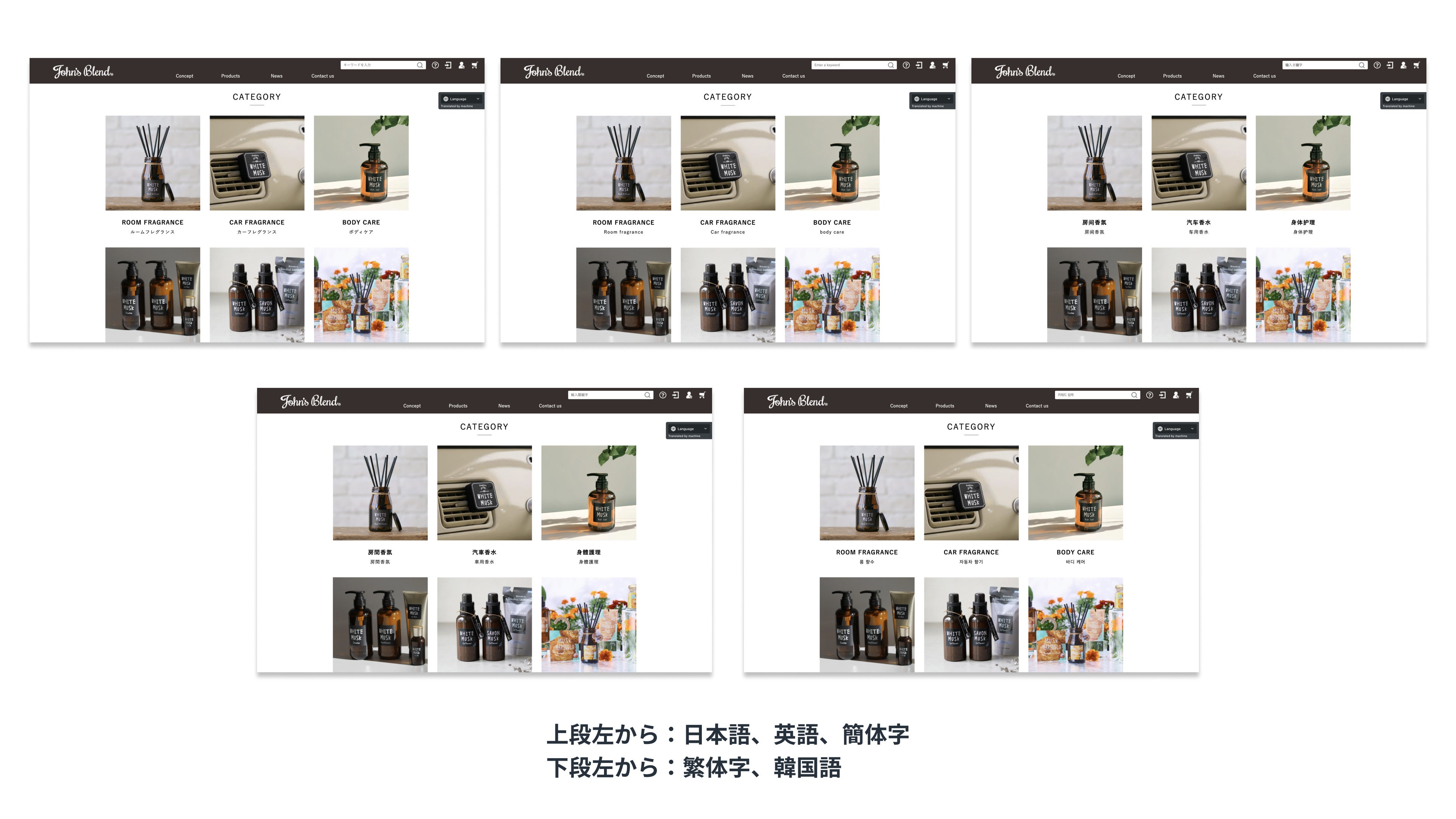 「John’s Blend」は、「いい香りを身近に感じることで、日々の生活が豊かになってほしい」という想いから生まれたフレグランスブランドです。人気の「ホワイトムスク」の香りを始め、フレグランス・ボディケア用品を豊富に取り扱っており、国内での人気も高まっております。こうした魅力ある商品の海外展開をさらに強化するべく、今回ウェブサイトの多言語化に踏み切りました。商品詳細だけでなく、ブランドコンセプト、コラム、ニュースなどの情報発信にも力を入れ、ブランドの魅力を海外のお客様にも届けています。