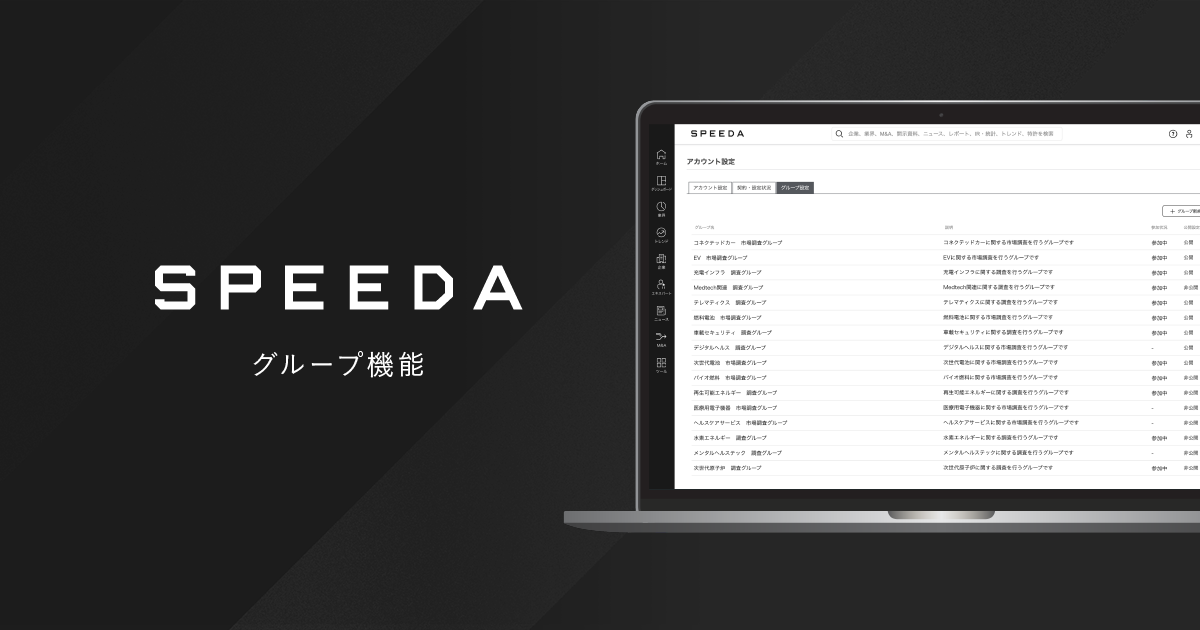 今回リリースした「グループ機能」は、SPEEDAユーザーを部署・プロジェクト組織・リサーチ対象の市場など、必要な単位でグループ化し、グループ内に情報を蓄積、共有することができる機能です。
