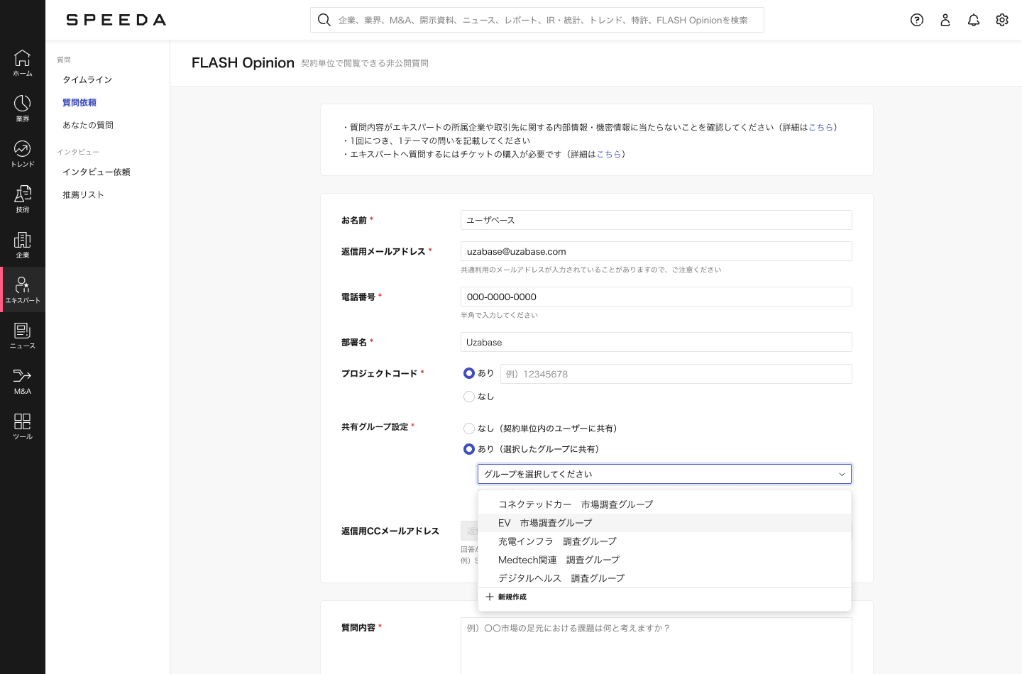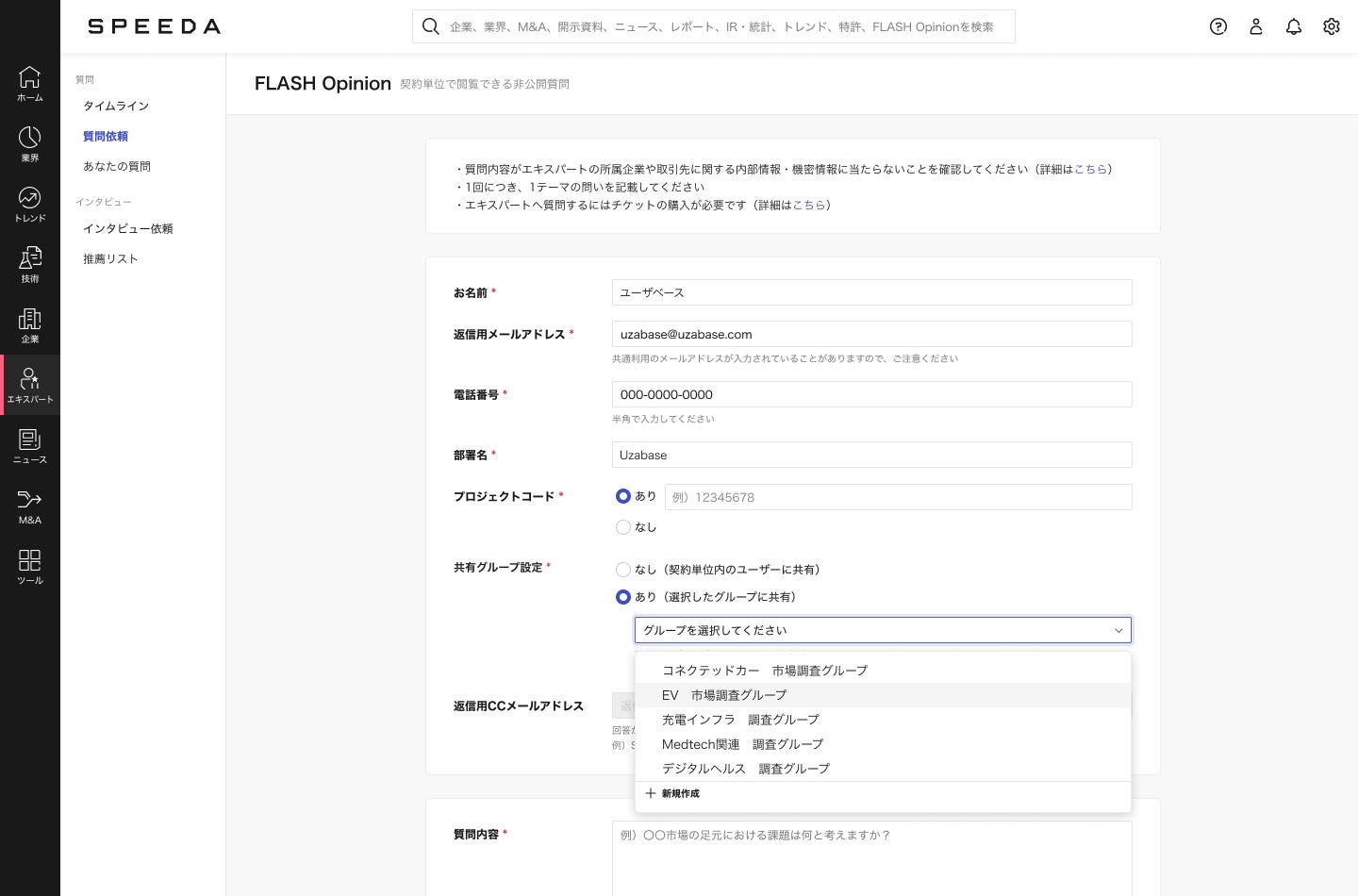 作成したグループは、SPEEDA上の情報コンテンツを紐づけることができます。2023年4月現在では日本語で180媒体以上、英語では1,500媒体以上のニュースに加え、質問に対して専門家から24時間以内に5件以上の回答が寄せられる「FLASH Opinion」、特定業界や領域のエキスパートに1時間のインタビューができる「EXPERT Interview」の3つを紐づけることができます。