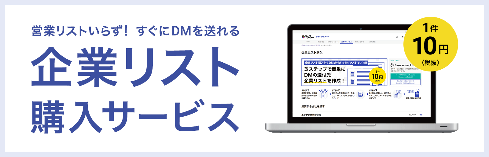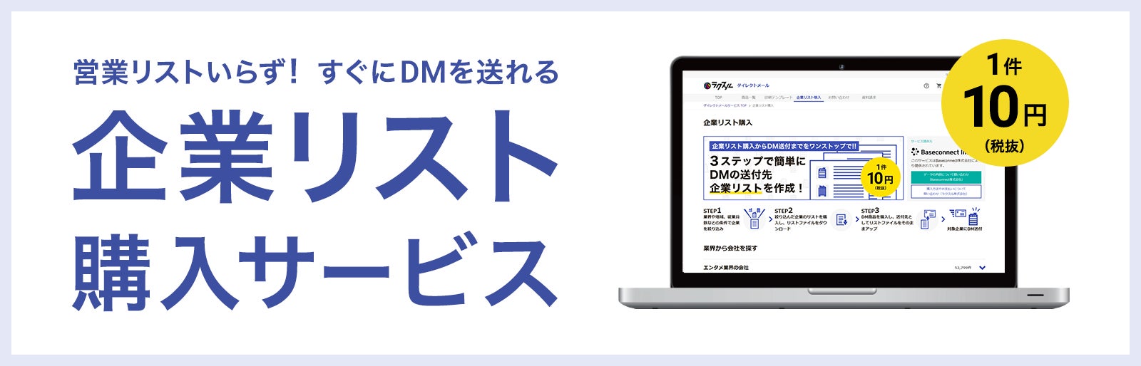 ラクスル株式会社(本社:東京都品川区、代表取締役社長CEO:松本恭攝、以下「当社」)が運営する印刷・集客のプラットフォーム「ラクスル」は、企業リストを選定し、DM(ダイレクトメール)発送利用までワンストップで行うことが可能な「企業リスト購入サービス」の提供を開始しました。本サービスは、Baseconnect株式会社との協業により、140万件以上の企業・事業所データを活用し、業界・従業員規模・売上などの条件から検索することで、ダイレクトに必要な情報にアクセスすることができます。ラクスルは、本サービスを通じて企業の皆さまの新規顧客獲得における生産性向上と目標達成を支援してまいります。