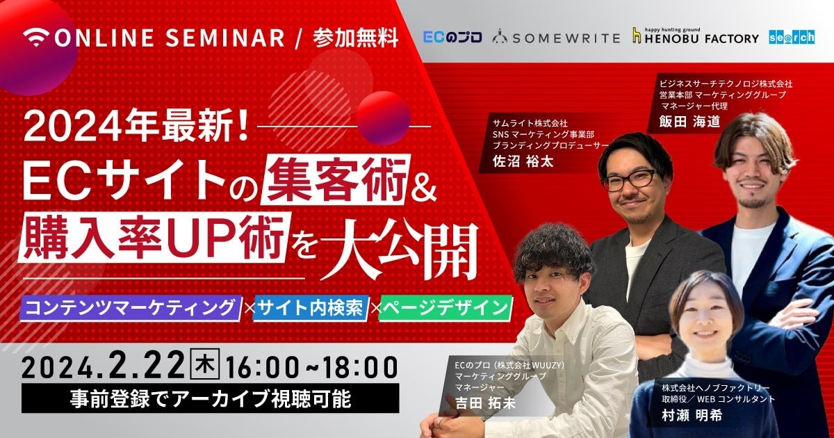 サムライト、4社共催で「2024年最新!ECサイトの集客術&購入率UP術を大公開〜コンテンツマーケティング×サイト内検索×ページデザイン」をテーマとしたオンラインセミナーを開催