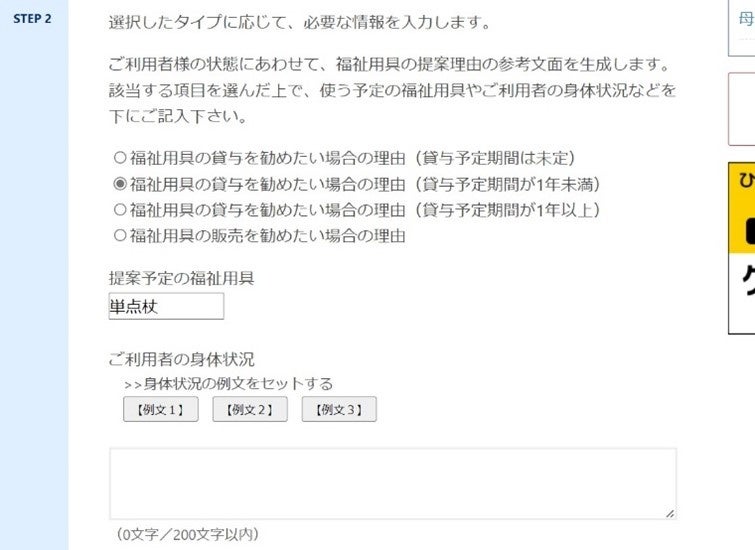 ②ご利用者に勧めたい利用方法や想定される使用期間、具体的な用具の種類を選んだ上で、ご利用者の身体状況を入力します。