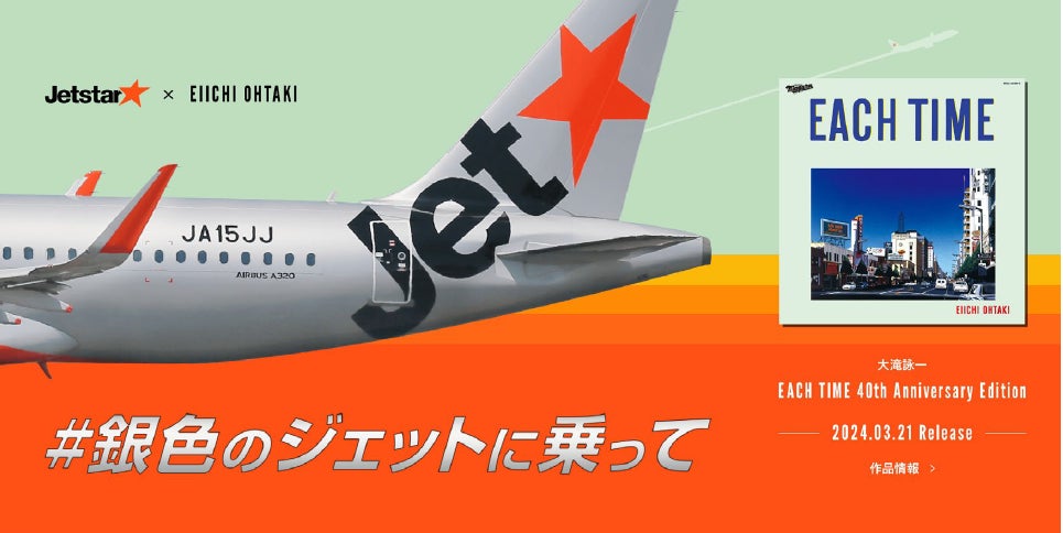 国内外の幅広い世代から支持を得ている “日本ポップス界の巨人”大滝詠一。彼のアルバム作品の中でも人気の高い「EACH TIME」が発売40周年を迎えることを記念し、2024年3月21日に「EACH TIME 40th Anniversary Edition」が発売されます。同アルバムに収録されている楽曲『銀色のジェット』がジェットスターの銀色の機体を彷彿とさせることから、今回のコラボレーションが実現。大滝詠一の曲をリアルタイムで聴いていた50~60代はもちろん、シティポップの人気が再熱している20~30代の若者にもアプローチし、旅情感あふれる楽曲を聴きながら “銀色のジェットに乗って”旅に出たくなるキャンペーンを順次実施していきます。