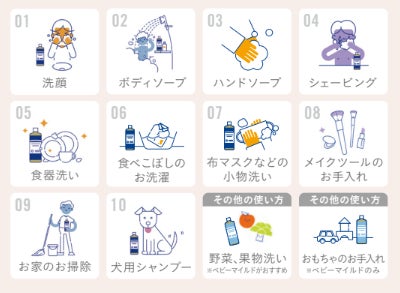 様々な用途に使用できます。布マスクなどの小物洗いやメイクツールのお手入れなど、バスタイム以外でも香りを楽しむことができます。
