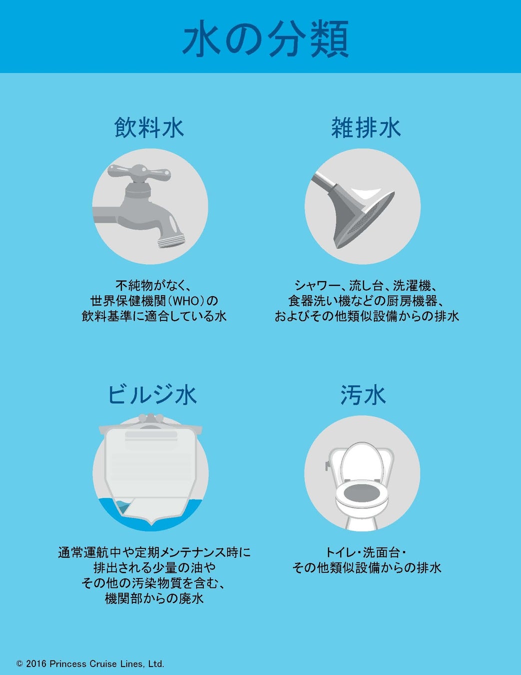 船底で回収された汚水「ビルジ水」は、エンジン室の機材から排出されたオイルを含んでいるため、プリンセス・クルーズでは、ビルジの容量水を必要最低限に抑え、適切な保水タンク量と排出方法を確保し、可能な限り機械のオイル漏れを防ぎ、最新型の分離装置に切り替えるなど様々な対策に取り組んでいます。(参考:排水処理について(https://www.princesscruises.jp/pdf/Bilge_Water_Process_Infographic_JP.pdf))