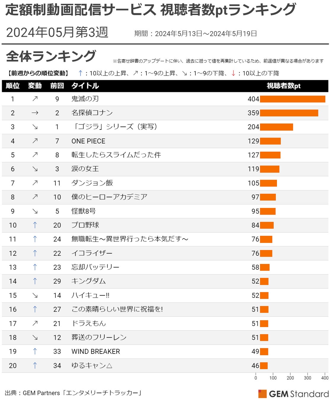 エンタテイメント業界に向けたデータ×デジタルマーケティングサービスを提供するGEM Partners株式会社(ジェムパートナーズ、所在地:東京都港区、代表取締役:梅津文)は5月22日、複数の定額制動画配信サービスを横断集計した2024年5月第3週(2024年5月13日~2024年5月19日)のコンテンツ別(※1)視聴者数ptランキング(全体・男性・女性)を発表します。