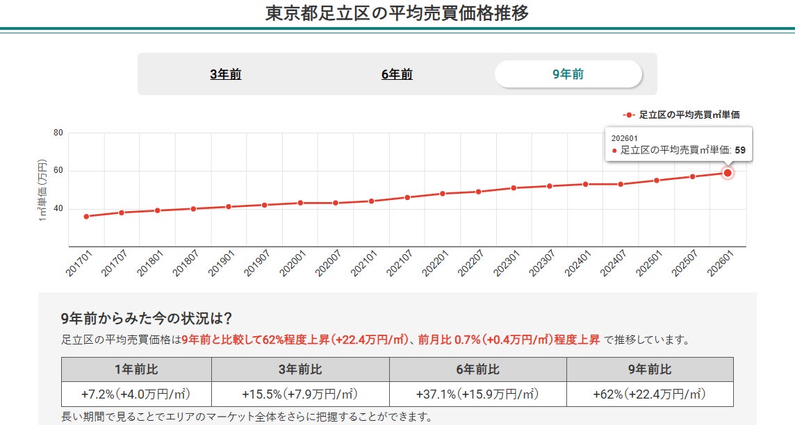 足立区の平均売買価格は過去9年間(2017年~2026年)で62%上昇しています。 特筆すべきは、急激な高騰・下落が少なく、安定したなだらかな上昇トレンドで推移している点です。再開発による街の魅力向上や子育て世代の流入が、堅調な価格上昇を支えています。