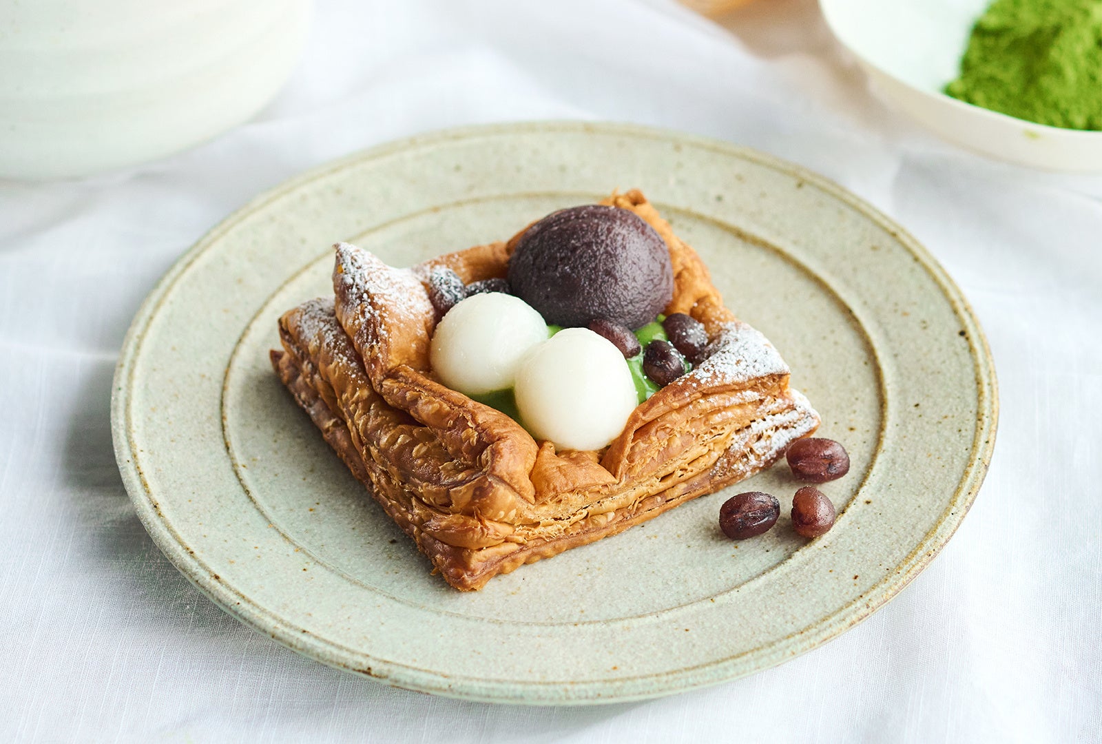 静岡県産天竜抹茶ペーストを使用した抹茶カスタードクリームをたっぷりと絞り、上からこしあん・鹿の子・白玉を贅沢にトッピング。和スイーツ定番の食材をふんだんに盛り合わせた贅沢なオープンパイです。