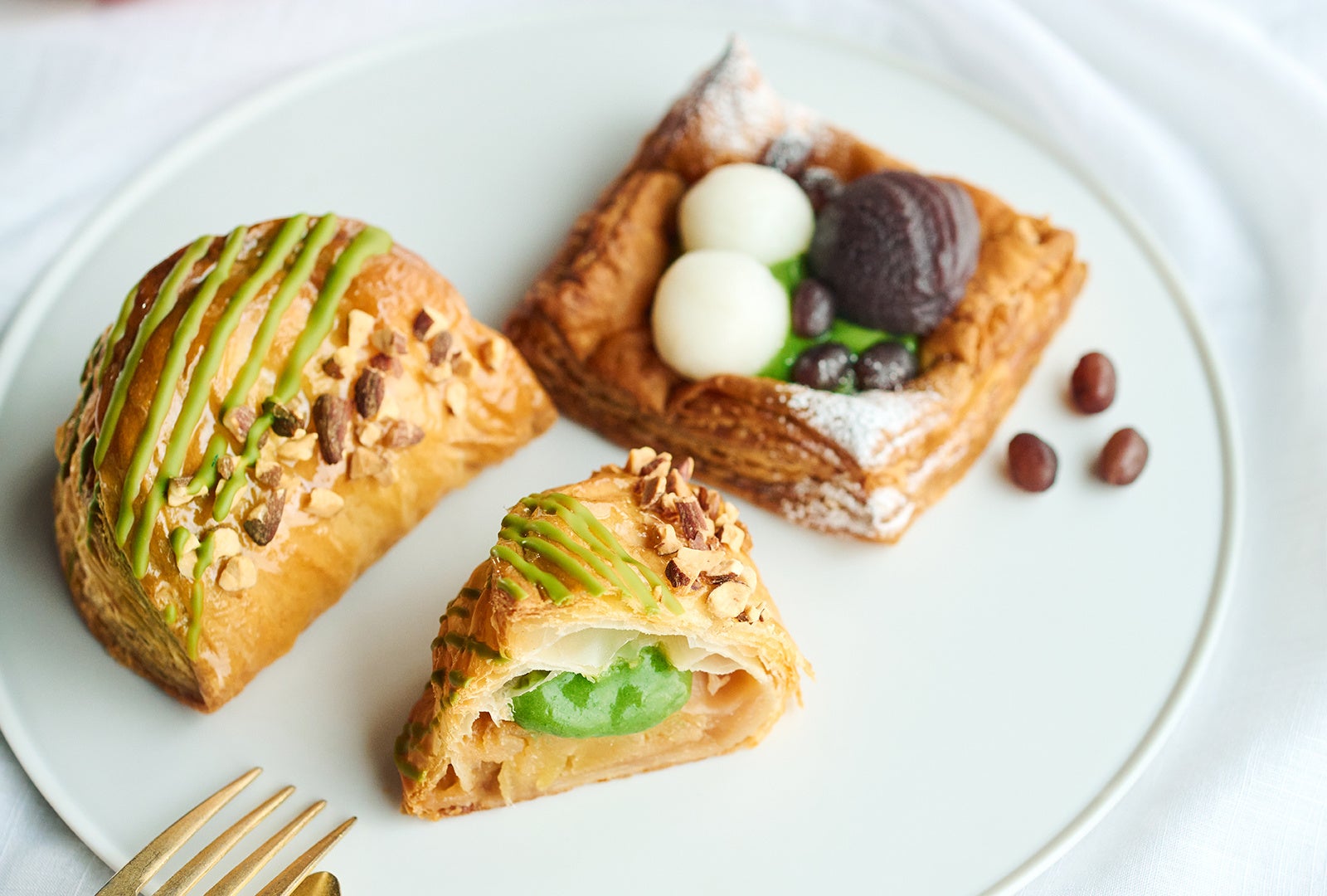 ワンハンドで贅沢なスイーツタイムを楽しめる「RINGO」のラインナップに、期間限定で「焼きたてカスタードアップルパイ 天竜抹茶」が登場。静岡県産の天竜茶(※)を使用したカスタードクリームをたっぷりと詰めた逸品で、深く広がるような香り高い抹茶とリンゴの甘みが絶妙です。ほろ苦さと甘みが織りなす季節限定の味わいを、144層のサクサクなパイの食感とともにお楽しみください。