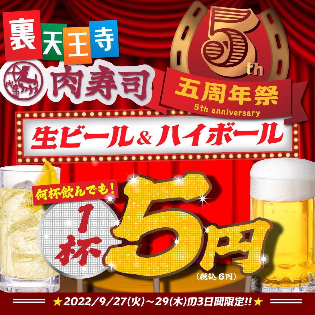 ”寿司×肉”で人気を博す居酒屋『裏天王寺 肉寿司』(運営:株式会社TBI JAPAN、本社:東京都新宿区、代表取締役社長 後藤 浩之)は、<オープン5周年>を記念して、2022年9月27日(火)~29日(木)の期間限定で、【生ビール、ハイボールが何杯飲んでも1杯5円(税込6円) 】となる"5周年記念キャンペーン"を実施いたします。