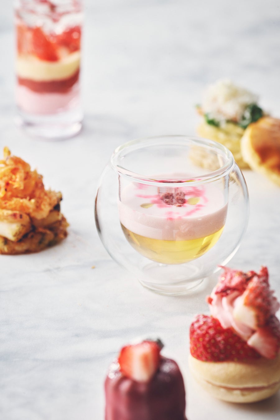 春の訪れを感じる、桜×いちごの最強コンビネーションをぎゅっと凝縮!キュートなビジュアルとは裏腹に、すっきりとした甘さのお米のババロアに日本酒のゼリーや桜を合わせた大人な味わいのパフェ、求肥に包まれた粒あんにスライスいちごをトッピングしたいちご大福、桜リキュールとコンソメゼリーの桜ヴィシソワーズなど、スイーツもセイボリーも春爛漫!淡く儚い桜ピンク、エモーショナルないちごの紅色、春に一斉に芽吹く草木のようなやわらかなグリーンと、見た目にも春の息吹を感じるココロ浮き立つアフタヌーンティーです。