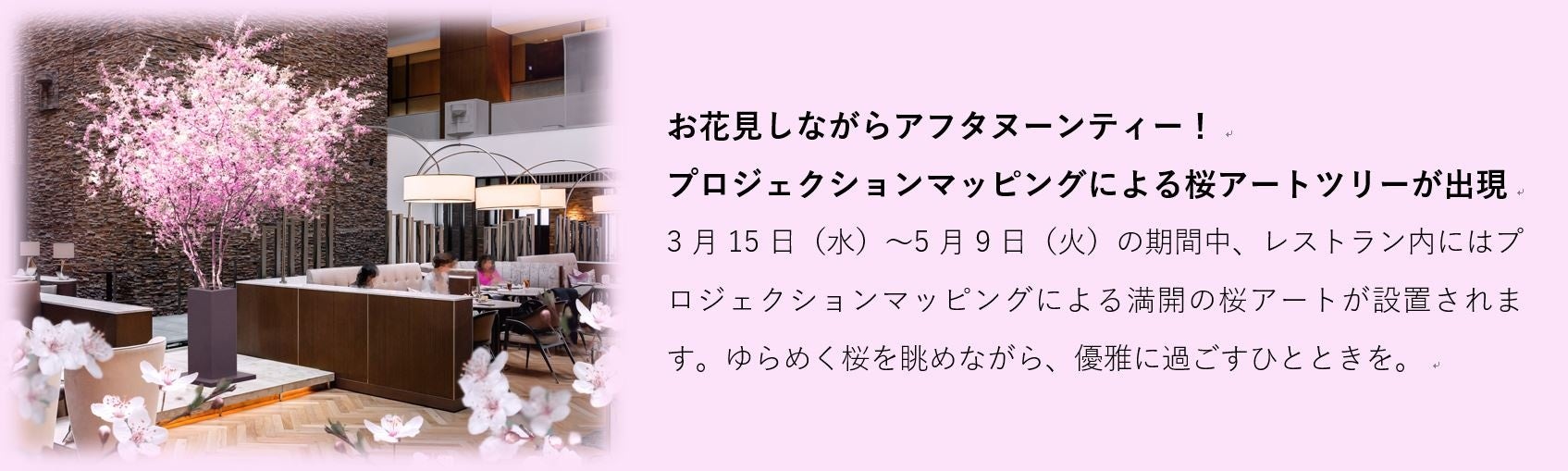 | お花見しながらアフタヌーンティー! プロジェクションマッピングによる桜アートツリーが出現 3月15日(水)~5月9日(火)の期間中、レストラン内にはプロジェクションマッピングによる満開の桜アートが設置されます。ゆらめく桜を眺めながら、優雅に過ごすひとときを。 |