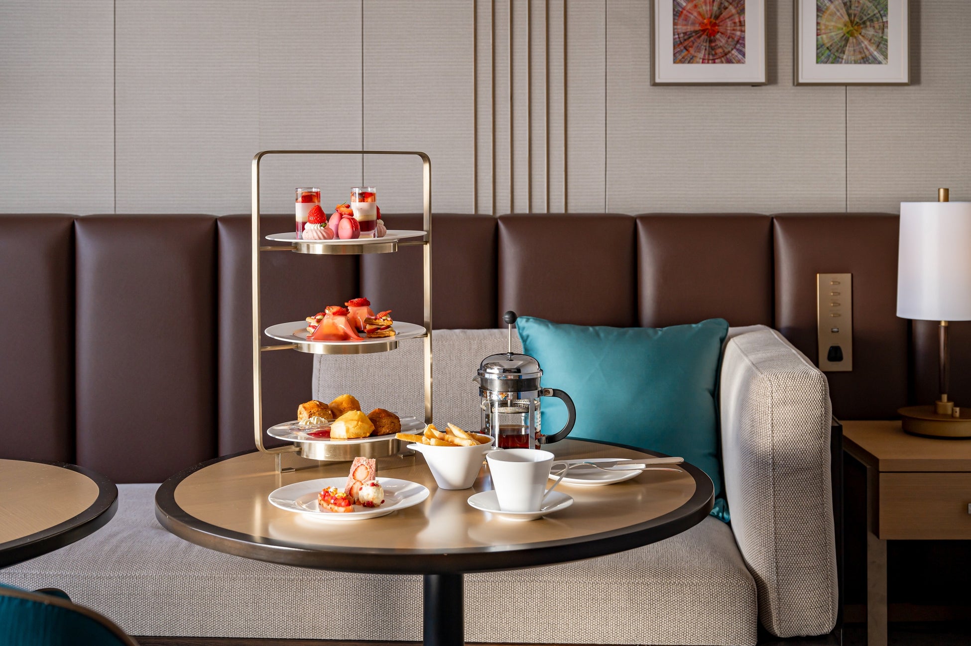 「桜いちご アフタヌーンティー」セットに弊ホテルで人気のトリュフ風味のフライドポテトが付いた夜のプランです。