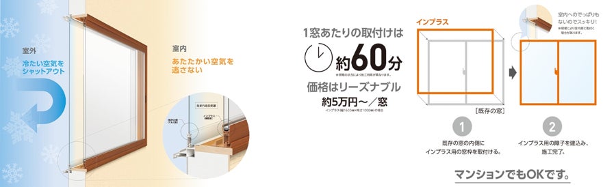 そのひとつとして内窓を設置することも非常に有効です。内窓を設置することで、既にある窓との間に空気の層がうまれ、断熱材の役割を果たすことができます。例えば、9カ所の窓に内窓(インプラス)を設置した場合、748kwh(※1)もの節電になり、年間冷暖房費にして約20,000円(※1)も節約することが可能です。取付けは、1窓あたり約60分ほど(※2)で出来るので、近年、手軽に出来る断熱リフォームとして行う人が増えています。