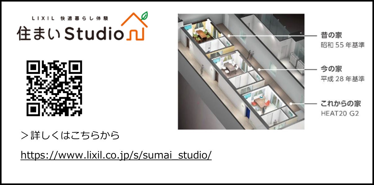 住宅の断熱性能の違いを体感出来る、「住まいStudio」には同じ冬の時期の温度条件下(0℃)で異なる断熱性能の基準で作られた3つの部屋があります。3つの部屋を比較すると、リビングとトイレの温度差は昔の家になるほど大きくなることが分かります。