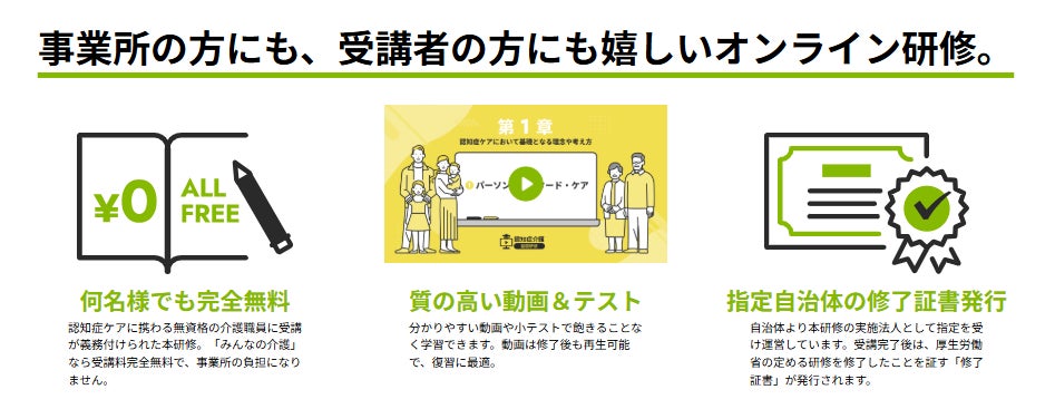 本サービスの導入により、事業所は研修の実施に伴う運営面での負担や調整コストを大きく削減できます。オンライン提供のため、業務の合間や自宅など、時間や場所にとらわれない柔軟な学習環境を提供できる点も大きなメリットです。また、修了証明書の発行により、事業所におけるコンプライアンス強化や教育体制の整備にも寄与します。多忙な介護現場においても、無理なく効率的に職員研修を進められる仕組みを提供しています。