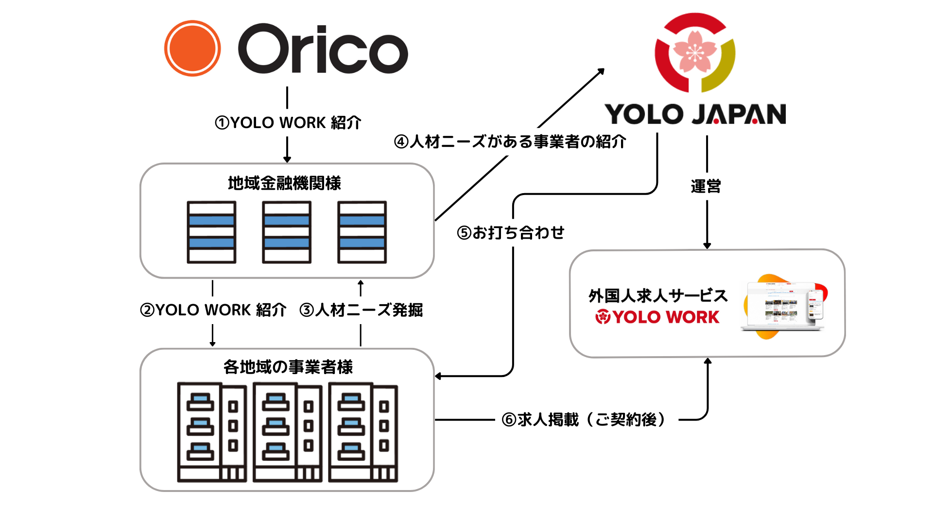オリコは、全国にある提携金融機関の取引先企業に対して、労働力確保を課題としている全国の事業者をYOLO JAPANに紹介いたします。また、YOLO JAPANは、在留外国人材26万人が登録している「YOLO WORK」内で、サービス利用契約を締結した事業者の求人掲載を行い、事業者と外国人材のマッチングを推進いたします。加えて、外国人材にも分かりやすく、応募につながりやすい求人募集の作成方法や内容をご提案いたします。また、専用サポート電話窓口や問い合わせフォームも設けており、掲載後のサポート体制も整えています。