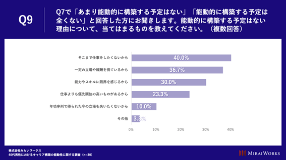 Q7で「あまり能動的に構築する予定はない」「能動的に構築する予定は全くない」と回答した方に、「Q9.能動的に構築する予定はない理由について、当てはまるものを教えてください。(複数回答)」(n=30)と質問したところ、「そこまで仕事をしたくないから」が40.0%、「一定の立場や報酬を得ているから」が36.7%、「能力やスキルに限界を感じるから」が30.0%という回答となりました。