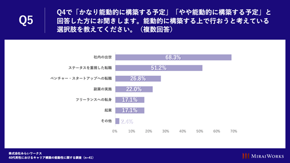 Q4で「かなり能動的に構築する予定」「やや能動的に構築する予定」と回答した方に、「Q5.能動的に構築する上で行おうと考えている選択肢を教えてください。(複数回答)」(n=41)と質問したところ、「社内の出世」が68.3%、「ステータスを重視した転職」が51.2%、「ベンチャー・スタートアップへの転職」が26.8%という回答となりました。