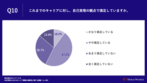 「Q10.これまでのキャリアに対し、自己実現の観点で満足していますか。」(n=108)と質問したところ、「かなり満足している」または「やや満足している」と回答した方が57.4%という回答となりました。