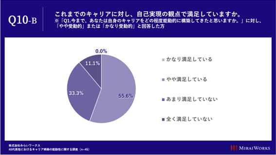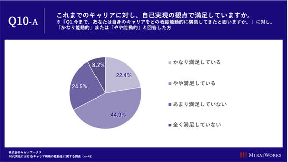 また、「Q1.今まで、あなたは自身のキャリアをどの程度能動的に構築してきたと思いますか。」という問いで「かなり能動的」または「やや能動的」と回答した方(n=49)の67.3%が、「Q10.これまでのキャリアに対し、自己実現の観点で満足していますか。」という問いに対し「かなり満足している」または「やや満足している」と回答しました。