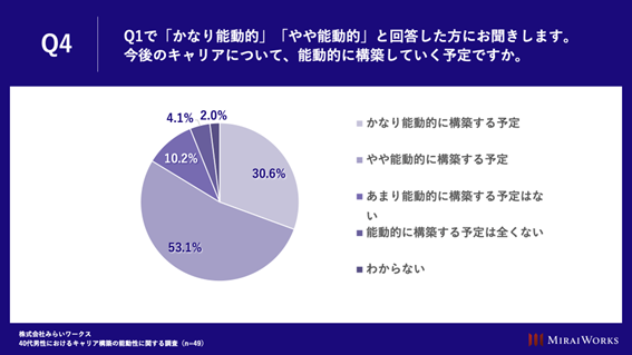 Q1で「かなり能動的」「やや能動的」と回答した方に、「Q4.今後のキャリアについて、能動的に構築していく予定ですか。」(n=49)と質問したところ、「かなり能動的に構築する予定」が30.6%、「やや能動的に構築する予定」が53.1%という回答となりました。