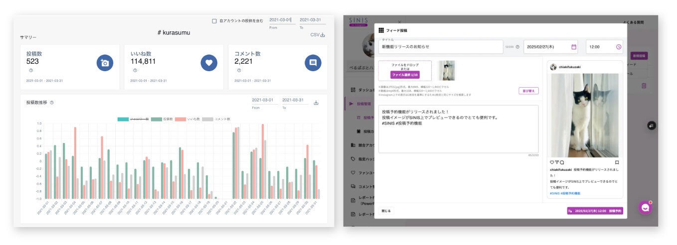 「SINIS for Instagram」は、企業のInstagramアカウントのインサイトデータをPC上で管理・分析することができ、効果的に運用のサポートをする分析ツールです。無料で登録することができ、直近45日間のデータを費用をかけずに分析ができます。有料プランなら登録以後のすべてのデータを閲覧できるだけでなく、分析レポートを自動で作成する機能やハッシュタグを分析する機能などさまざまな機能がご利用可能です。