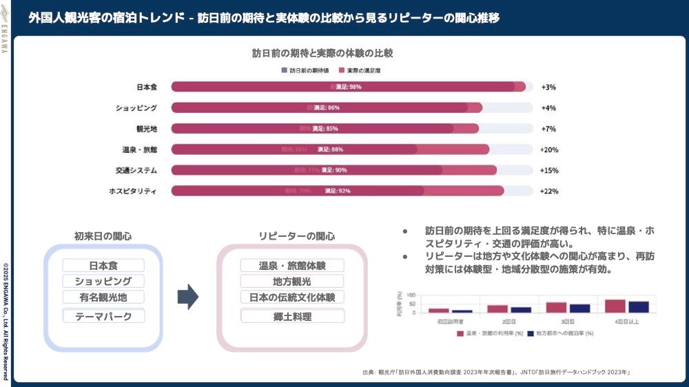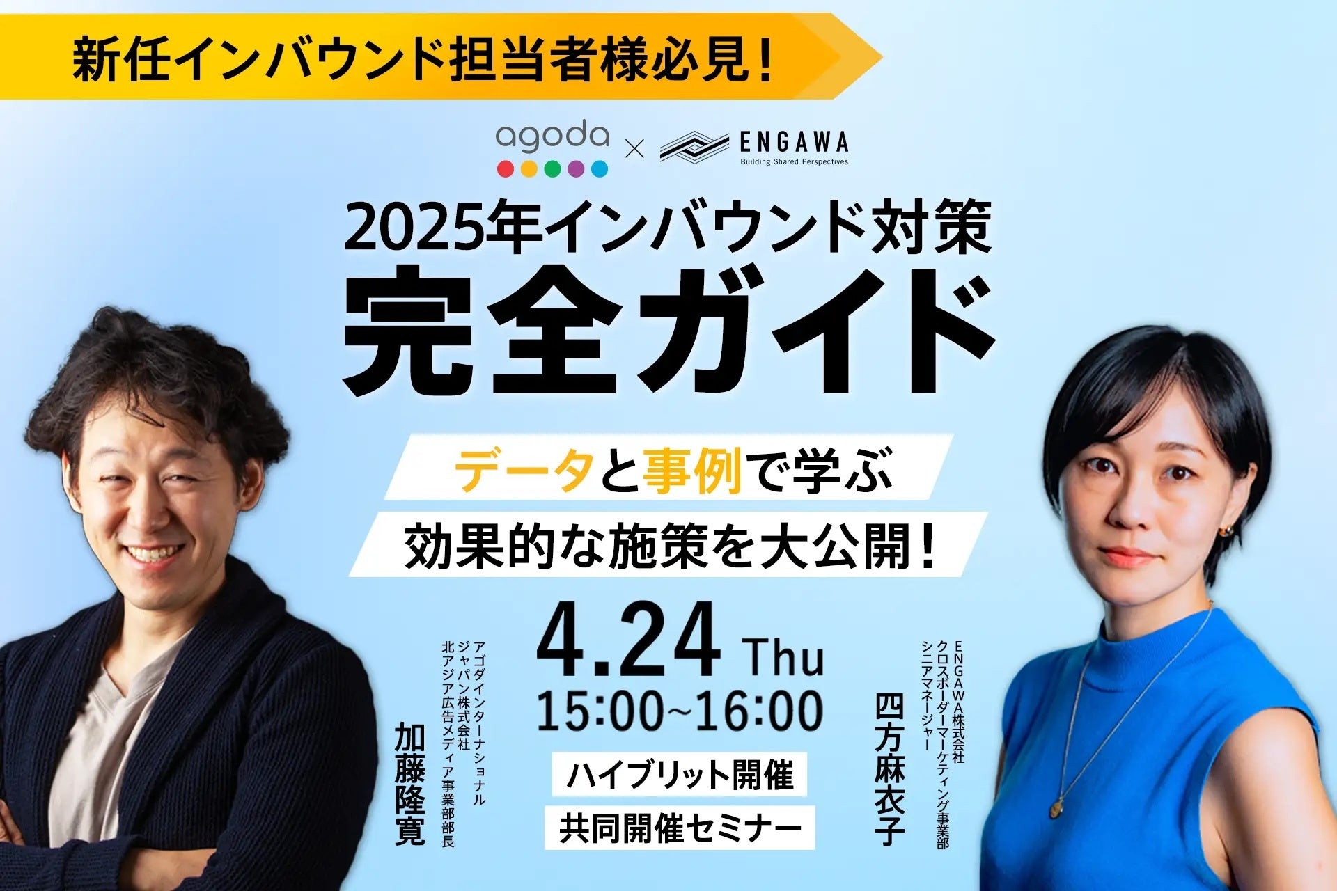 ENGAWA株式会社(本社:東京都港区、代表取締役社長:牛山 隆信)は、2025年4月24日(木)、Agoda Company Pte. Ltd.と共同でハイブリッドセミナー「2025年インバウンド対策完全ガイド ─ データと事例で学ぶ効果的な施策を大公開!」を開催しました。本セミナーでは、コロナ禍後の回復を遂げる訪日外国人旅行市場の最新動向を、データに基づいて分析し、多様化する訪日リピーターのニーズと、2025年に向けた効果的なインバウンド戦略について解説しました。