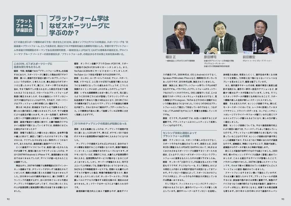 ・プラットフォーム学座談会1「プラットフォーム学はなぜスポーツリーグに学ぶのか?」京都大学大学院情報学研究科教授 原田博司、一般財団法人UPDATE EARTH理事長 福田 正、デロイト トーマツ グループ パートナー 前田善宏