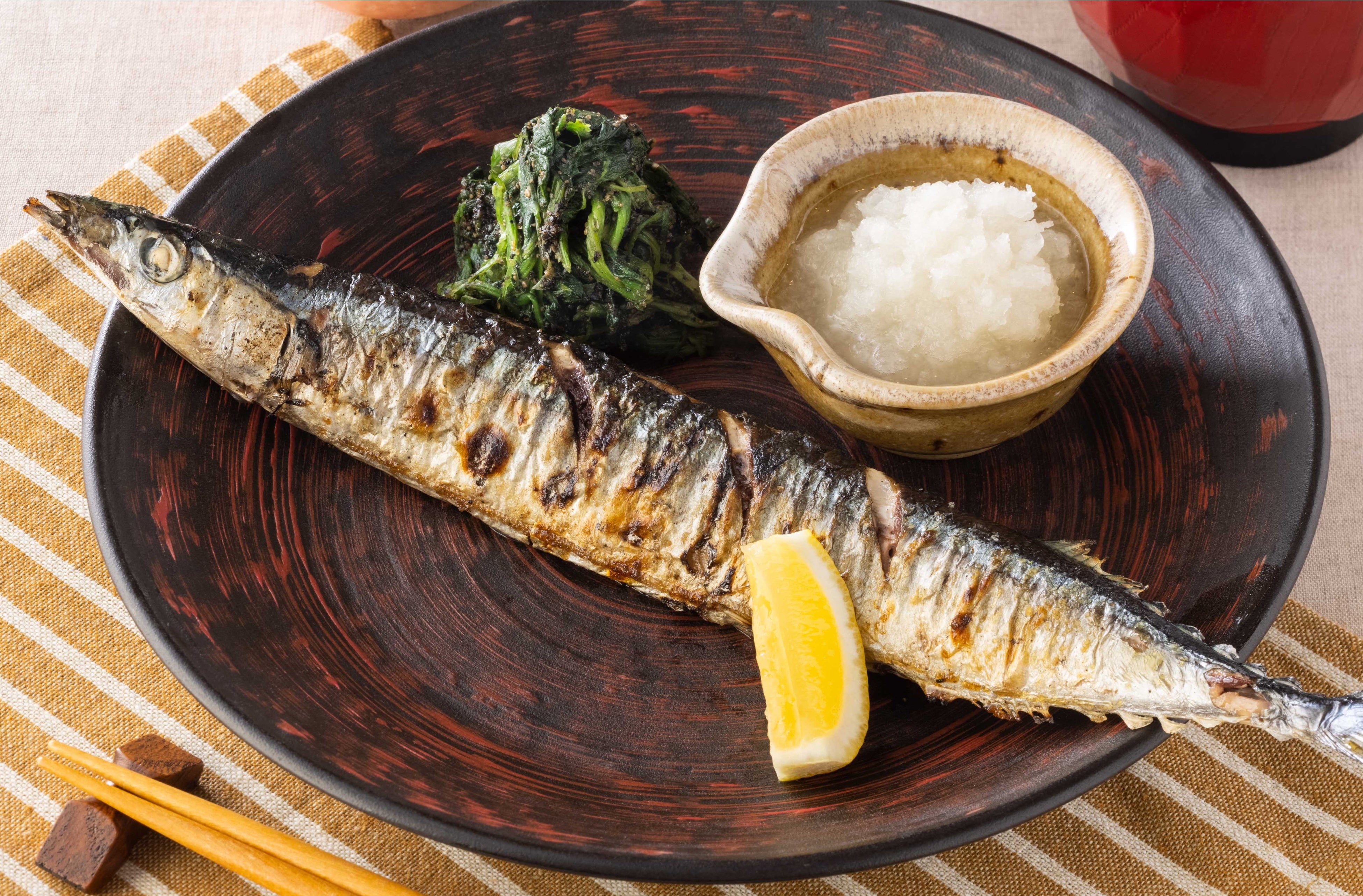 獲れたて新鮮な生さんまを産地直送で店舗へ配送し、炭火でパリッと焼き、おろしたての大根おろしをつけてご提供している「生さんまの炭火焼き」 は、大戸屋こだわりの秋の名物メニューです。