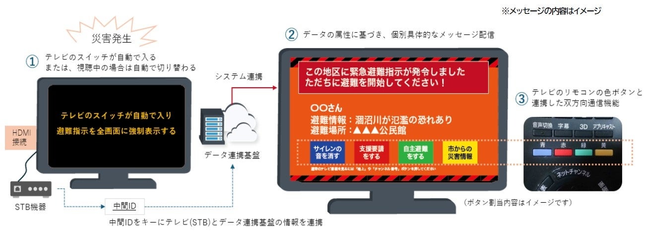 このような背景のもと、当社は各家庭に広く普及し、年齢を問わず誰でも扱うことができるテレビに着目。テレビを活用することで、災害時に住民に強く避難行動を促すとともに、自治体の情報発信に係る事務の効率化を両立する技術を開発、活用することを茨城県に提案し、採用されました。