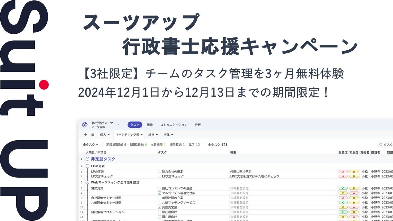 株式会社スーツ(所在地:東京都千代田区、代表取締役社長CEO:小松 裕介)は、チームでかんたん、毎日続けられるプロジェクト・タスク管理ツールの経営支援クラウド「Suit UP」(スーツアップ)において、行政書士応援キャンペーンを実施いたします。
