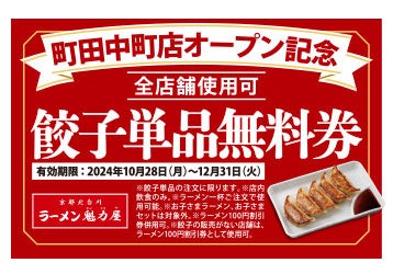 さらに!オープンを記念して、「町田中町店」にご来店いただいたお客様には全店舗でご使用いただける餃子単品無料券を配布いたします。