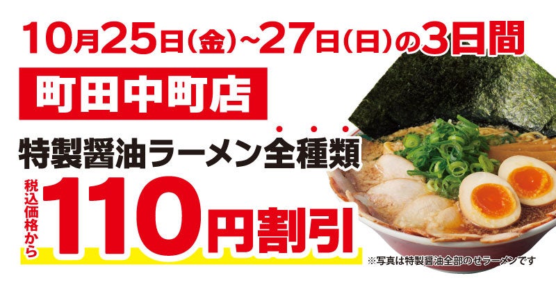 この度オープンを記念して、「町田中町店」にご来店いただいたお客様には、『特製醤油ラーメン全種類』を税込価格から110円割引で販売いたします。