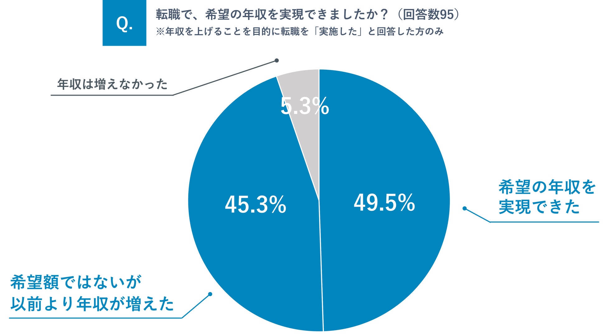 転職によって「希望の年収を実現できた」と回答した医師は 49.5%、「希望額ではないが、以前より年収が増えた」と回答した医師は 45.3%となり、9 割以上の医師が転職によって年収アップに成功した結果となりました。