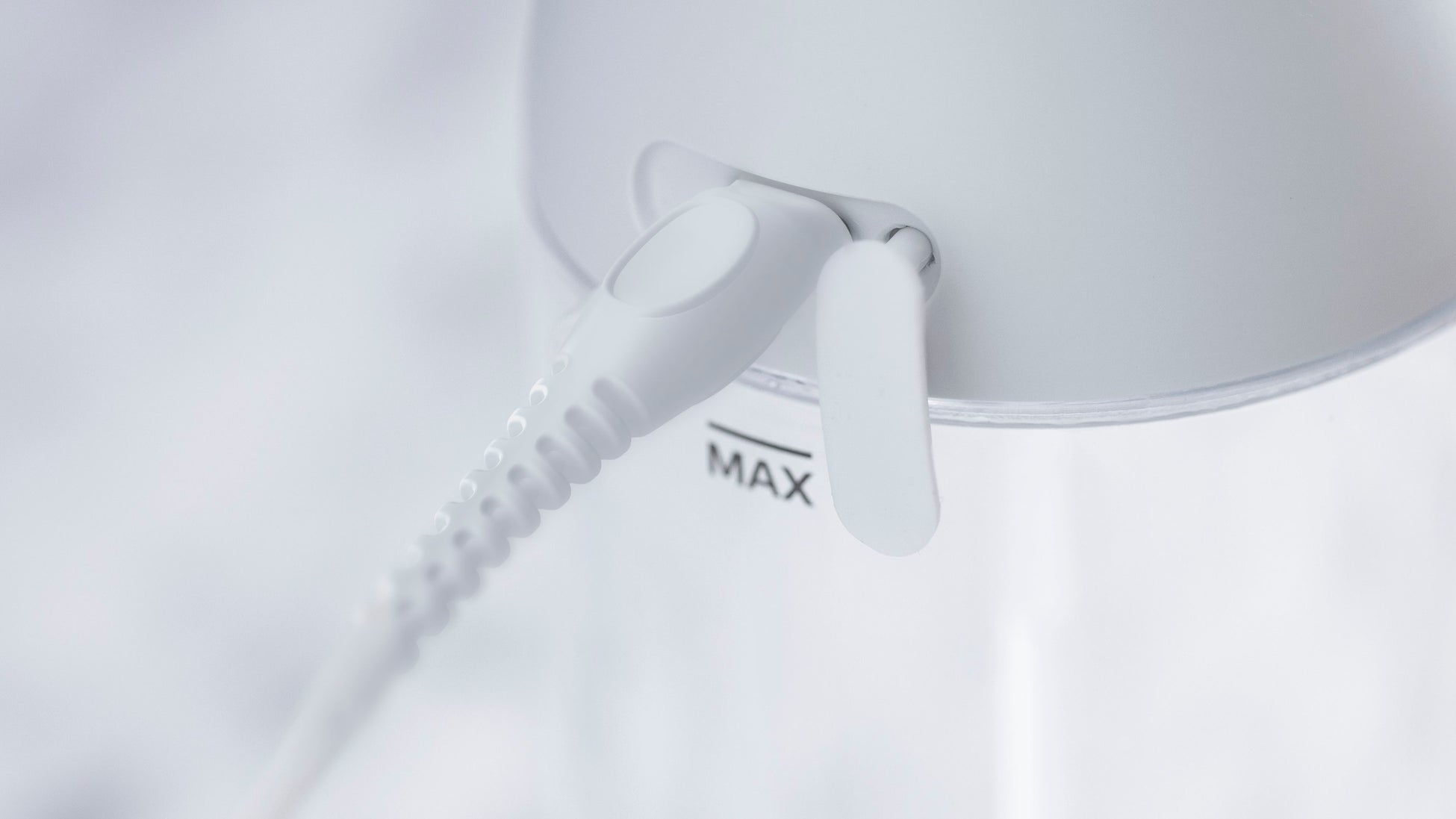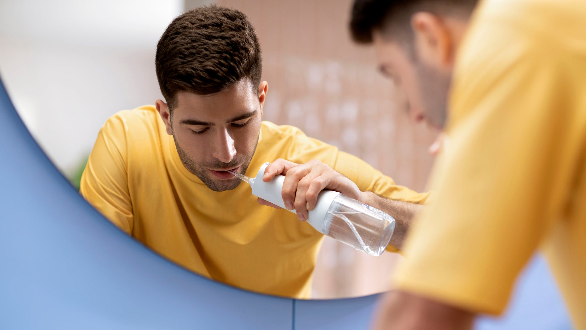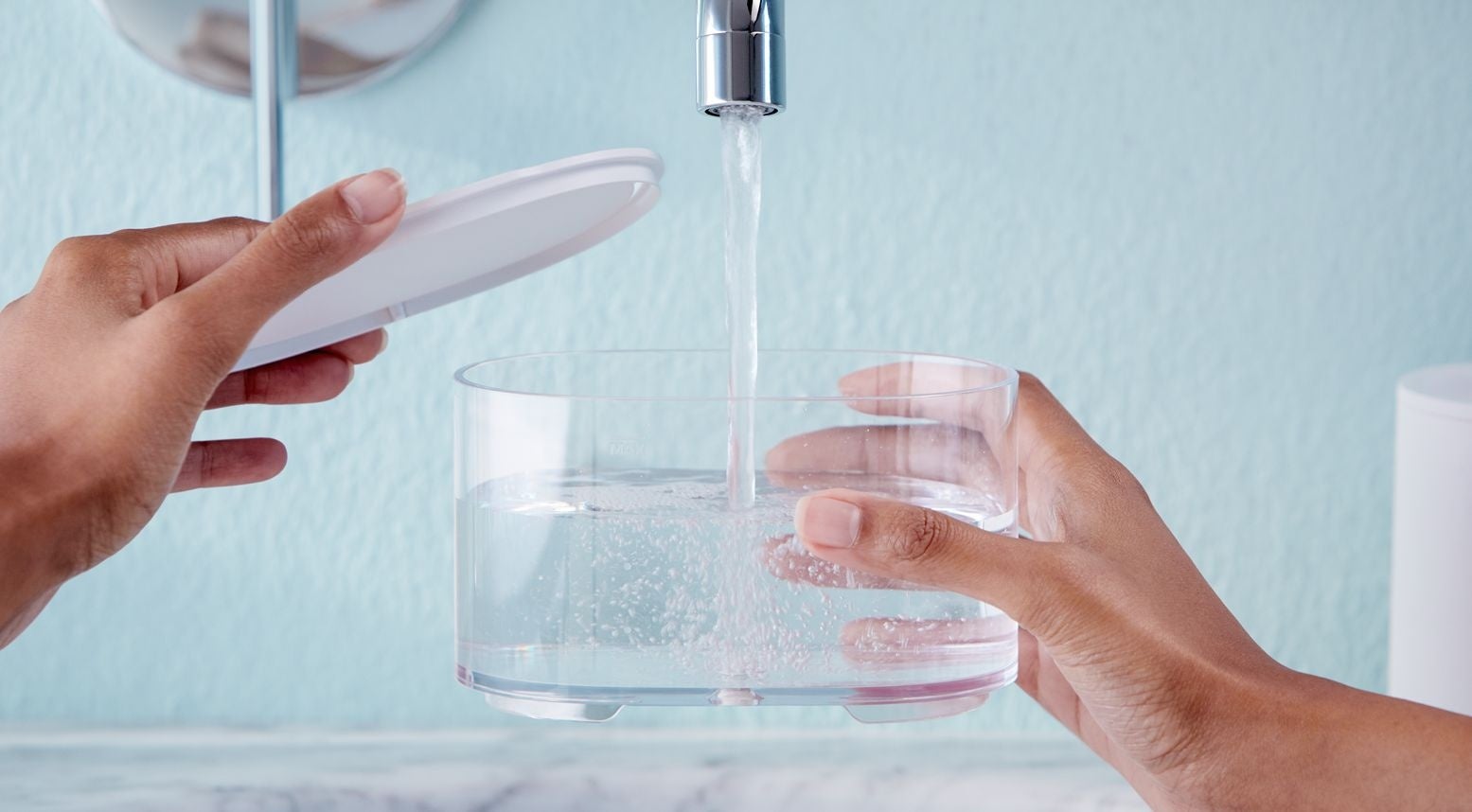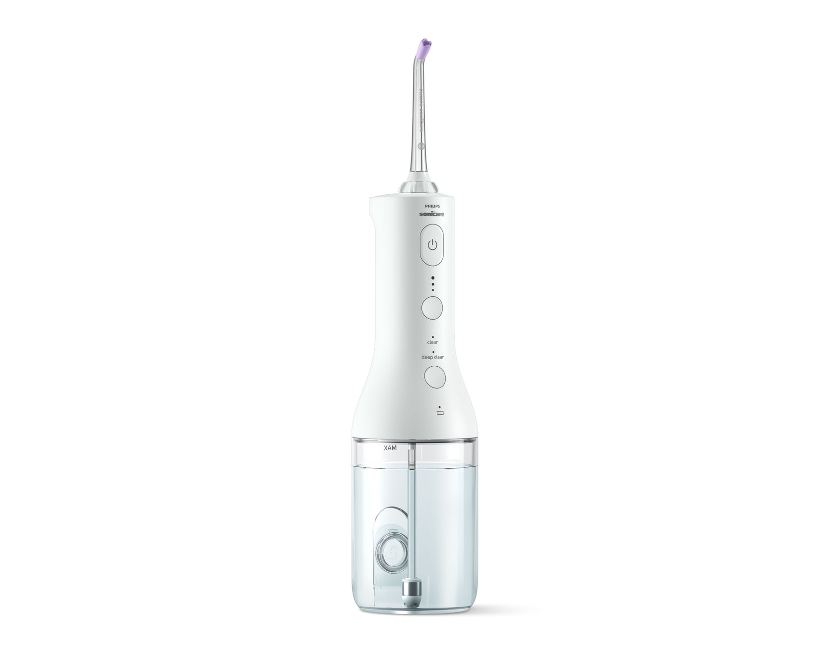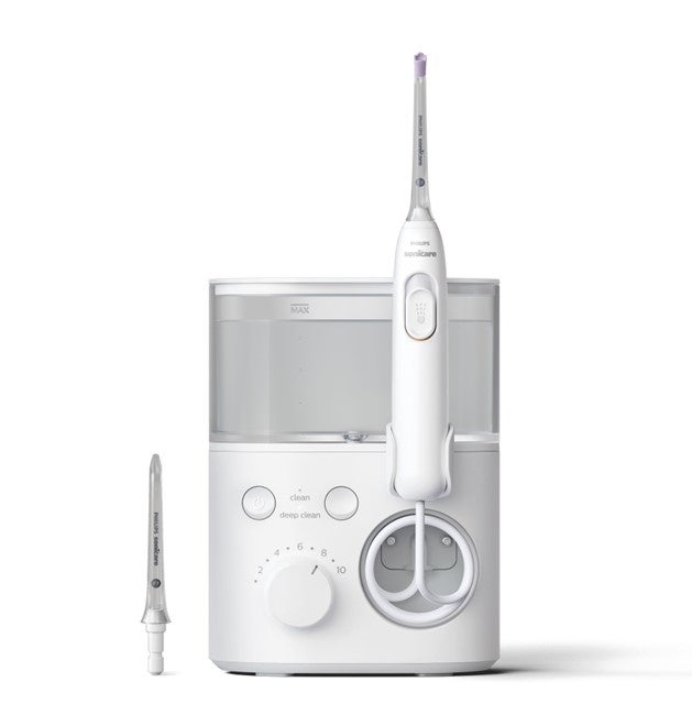 「ソニッケアーパワーフロッサー」は、4方向のノズルから出るX型水流で歯間の汚れを洗い流し、デンタルフロスの最大3倍の歯垢を除去[2]する口腔洗浄器です。矯正器具をご使用の方にもお使いいただくことができ、防水機能を搭載しているため、お風呂でも使用が可能です。
