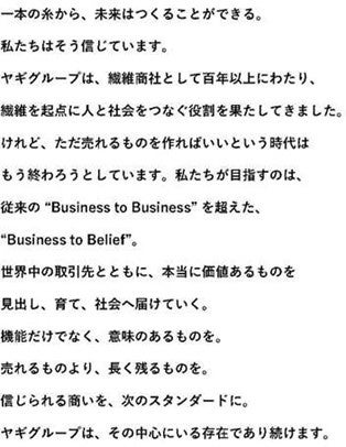 私たちの歩みを支えてきた「終始一誠意」と、新たに掲げる「Business to Belief」。これらは決して別個のものではなく、ヤギという企業を貫く一本の思想の線で結ばれています。