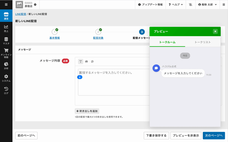 テキスト・画像・リッチメッセージに対応し、LINEのトーク画面上での表示をプレビューで確認しながら作成できます。